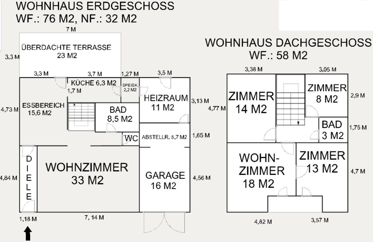 Essbereich, Wohnzimmer, Bad mit Wanne, sep. Toilette, Speisekammer, überdachte